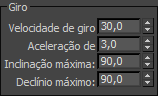 - O número de graus que o delegado inclinará como uma função do ângulo de giro no quadro atual. Por exemplo, se Inclinação por giro=1, o delegado irá inclinar um grau para cada grau que estiver girando em determinado quadro. Padrão=1,0.
