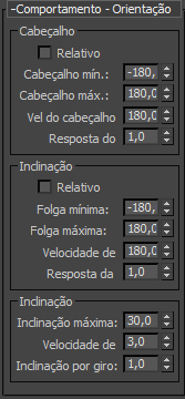 - O número de graus que o delegado irá inclinar conforme a função do ângulo de giro no quadro atual. Por exemplo, se inclinar por giro = 1, o delegado inclinará um grau para cada grau que for girado em um dado quadro. Padrão=1,0.