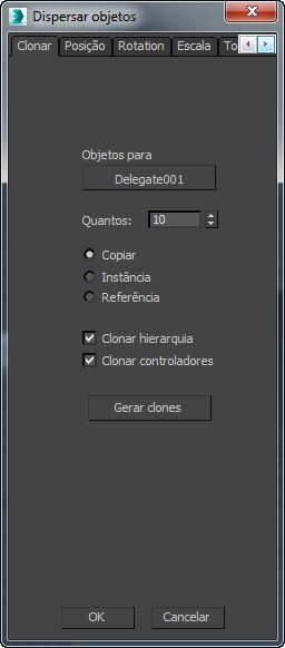 - Ative para duplicar o objeto selecionado com o botão Objeto a ser clonado. Ao clicar no botão Dispersão, o objeto será clonado e, a seguir, todas as transformações especificadas serão aplicadas nos clones.