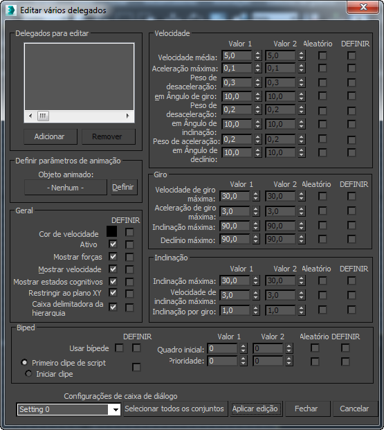 A caixa de diálogo Editar vários delegados permite definir grupos de delegados e parâmetros para eles. É possível criar e armazenar até 10 diferentes configurações ou combinações de configurações; cada uma consiste em um ou mais delegados e as configurações dos delegados.