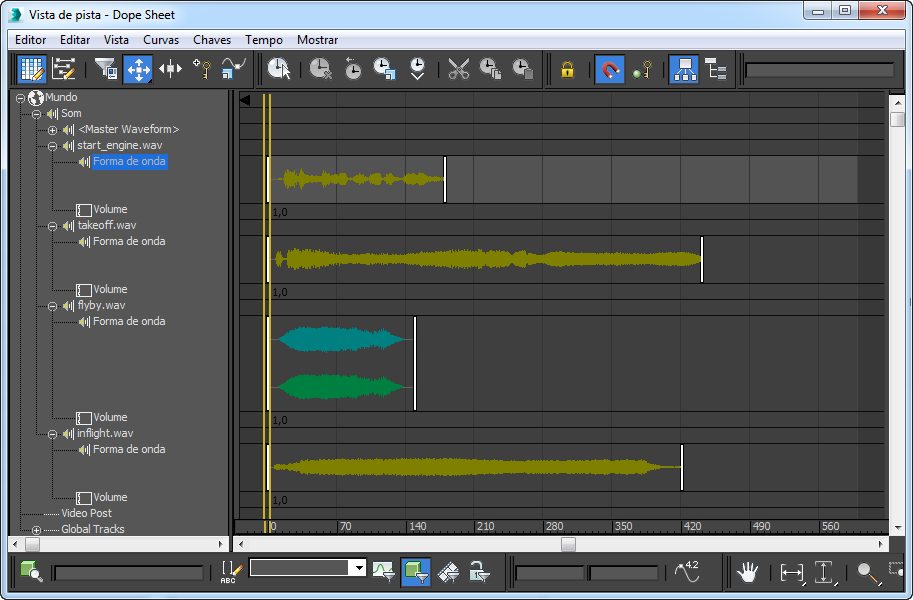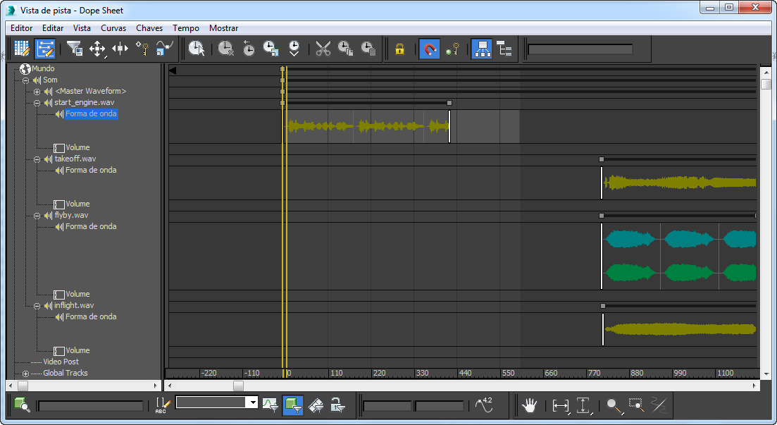Por ora, concentre-se apenas na trilha start_engine.wav, selecionando as outras barras de faixa no Dope Sheet e movendo-as para a direita, além do quadro 200.