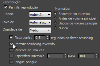 Para ouvir o áudio em reverso durante o scrubbing, realce a Trilha sonora e clique nela com o botão direito do mouse na hierarquia do Dope Sheet. No menu de quadrante, selecione Propriedades. Na caixa de diálogo ProSound grupo Reproduzir, ative Permitir scrubbing invertido.