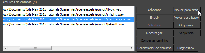 Na lista de arquivos de som do grupo Arquivos de entrada, realce start_engine.wav e clique em Mover para cima quantas vezes forem necessárias para inserir o arquivo no topo da lista.