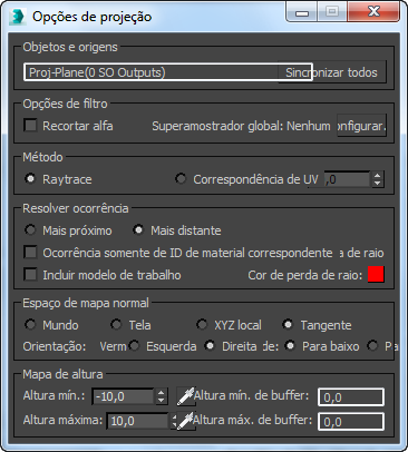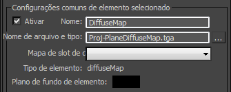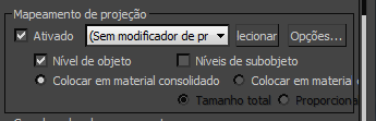 grupo Mapeamento de projeção, ative Ativado. Já que o objeto de plano para o qual você consolidará a textura consiste somente em uma única superfície plana, desative Níveis de subobjeto.