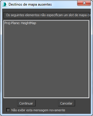 Clique em Continuar para fechar a caixa de mensagem Destinos de mapa ausentes. Nós deixamos deliberadamente o mapa de altura não atribuído porque, na próxima lição, você o atribuirá separadamente.