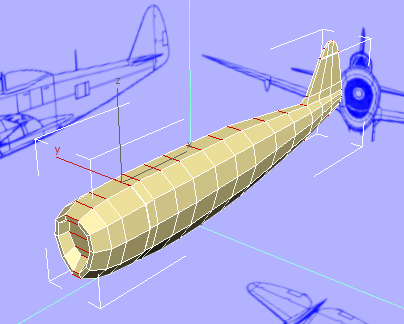 Selecione os três vértices em que a borda final do estabilizador se une à fuselagem e mova-os para frente ao longo do eixo X para uma melhor correspondência com o desenho do plano superior. No viewport superior, mova os vértices para baixo ao longo do eixo Y para que eles sigam o contorno da fuselagem (verifique isso no viewport Perspectiva).