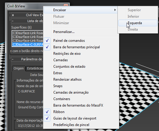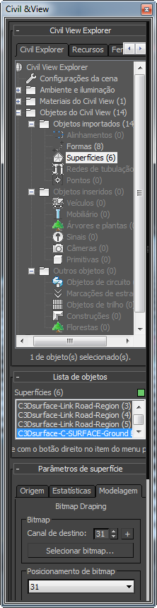 Civil View Explorer. O 3ds Max abre o Civil View Explorer, que é um painel comprido que oferece acesso à maioria dos recursos do Civil View.