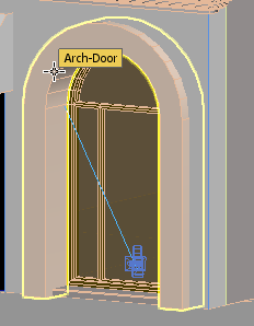 selecione uma face no objeto de arco. O 3ds Max exibe um gizmo amarelo, que representa uma projeção plana do material de tijolo na face selecionada.