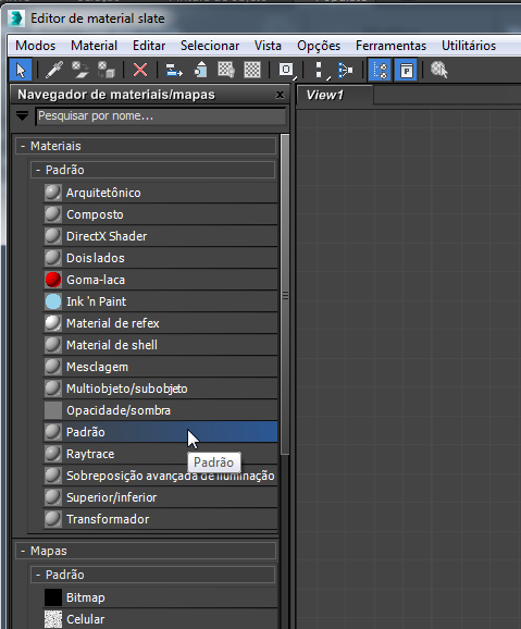 Arraste essa entrada para o painel Vista (View1) no centro da janela. O 3ds Max exibirá o material como um nó na Vista.