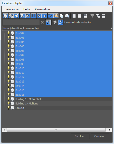 - Pressione H para abrir a caixa de diálogo Selecionar objeto. Na lista, selecione todos os objetos Caixa e, em seguida, clique em Selecionar.