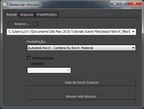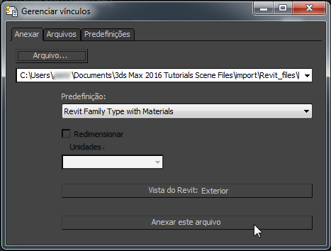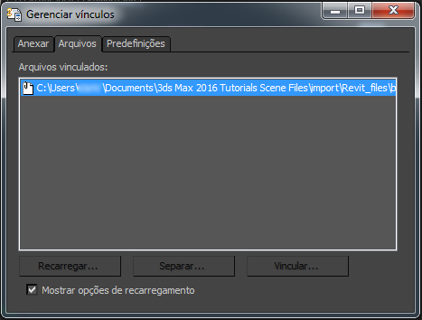 está vinculado à cena do 3ds Max. Você usará essa guia novamente após efetuar as alterações na cena no Revit; por enquanto, você concluiu a tarefa no Gerenciador de links de arquivo.