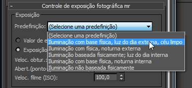 grupo Exposição, escolha Luz natural externa de iluminação física, céu limpo na lista suspensa Predefinição.