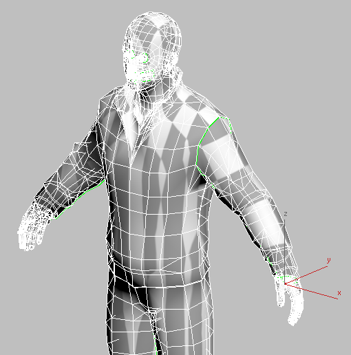 O modificador Desempacotar UVW criará um cluster a partir dos polígonos selecionados. Quando você descasca a manga, o que você fará em um minuto, o ferramenta Casca utiliza a junção criada na parte inferior da manga para planificar a forma como o cluster é mapeado. Desempacotar UVW também cria "junções de mapa", que não precisam ser especificadas explicitamente, nas arestas do conjunto de seleção.