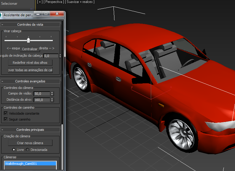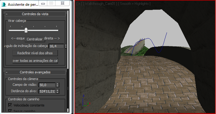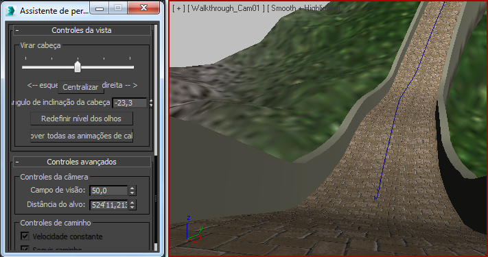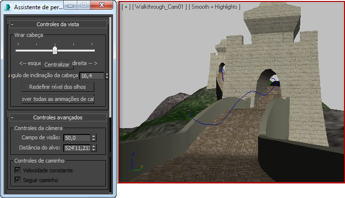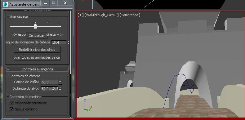 Nota: Desativar a opção Seguir Caminho redefine a orientação da câmera para seu valor padrão (positivo Y). Você corrigirá como iniciar a animação da rotação da cabeça na caixa de diálogo do assistente de percurso.