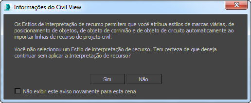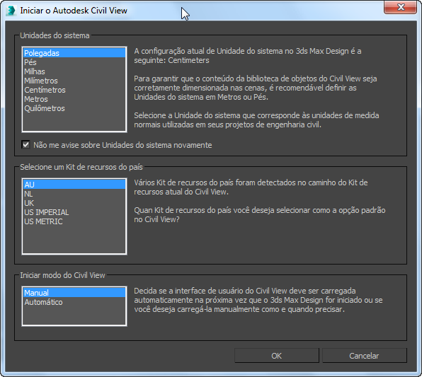 Depois de selecionar Inicializar, o 3ds Max exibe a caixa de diálogo Inicializar Autodesk Civil View.