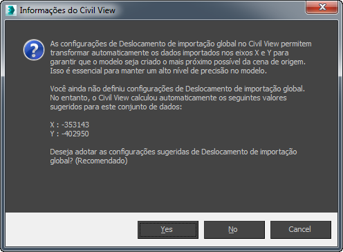 Quando os dados de projeto civil forem baseados em dados de pesquisador, as coordenadas podem ser bem grandes e deslocadas de um ponto de origem de (0.0). Carregando os dados sem alteração de origem pode levar a comportamentos estranhos da viewport e, mais importante, para modelagem imprecisa devido a erro de de arredondamento. Para evitar esses problemas, sempre use Global Import Shift.