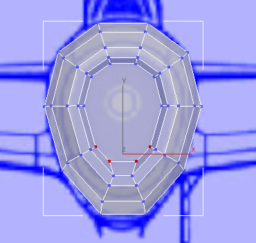 A frente da avião está quase concluída, por enquanto. Porém, devido a forma pela qual o 3ds Max construiu o cilindro que foi a origem do modelo, a face da entrada é um decágono. Como se mencionou anteriormente, é melhor se a malha for composta de forma consistente com polígonos quadrangulares: estes funcionam muito melhor com suavização e (se você estiver criando um personagem) com deformação de pele. Para completar a entrada de ar, você divide o decágono grande em quadriláteros menores.