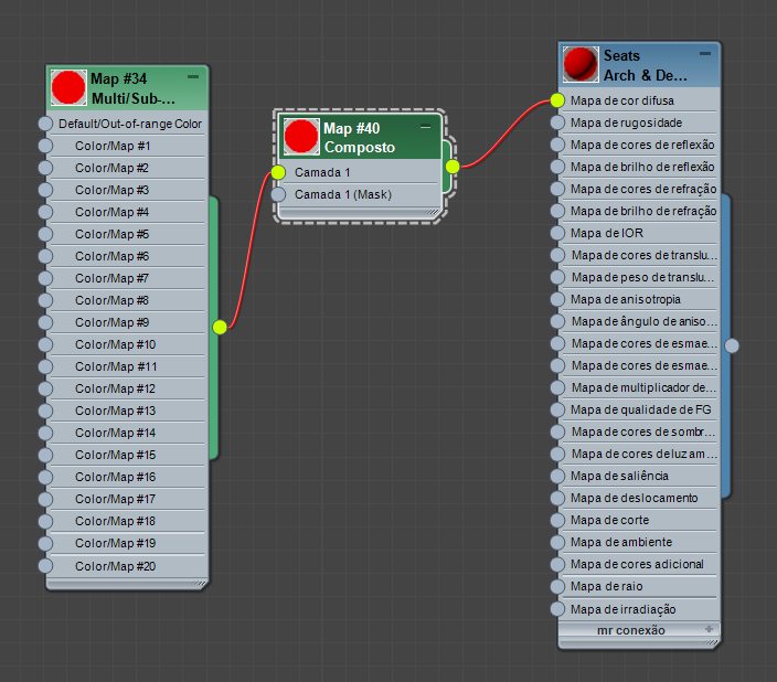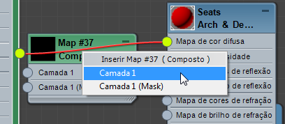 Composto) a partir do Navegador. Na Vista ativa, solte o mapa no arame que conecta o mapa Múltiplo/Submapa e o material dos assentos. O 3ds Max exibe um cursor que indica que você está inserindo o mapa no arame. Solte o botão do mouse quando este cursor surgir.