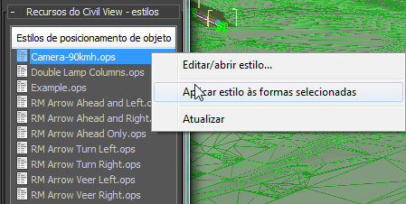 Nos Recursos do Civil View - implementação de Estilos lista de Estilos de posicionamento de objetos, clique com o botão direito do mouse na entrada Camera-90kmh.ops e a partir do menu suspenso selecione Aplicar Estilo à(s) Forma(s) Selecionada(s).