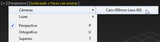 Clique ou clique com o botão direito do mouse no etiqueta da viewport POV (exibe atualmente "[Perspectiva]") e a partir do menu selecione Câmeras Came-050mm Lens-001.