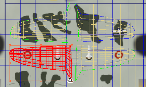 Modo de forma livre para girar a asa 90 graus para a esquerda e, em seguida, mova e dimensione as faces para inseri-las sobre o padrão de camuflagem para o lado esquerdo do padrão da asa esquerda.