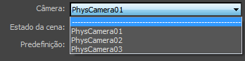 Por padrão, uma tarefa é definida para renderizar a viewport ativa, conforme indicado pela entrada "Viewport" na coluna Câmera da fila de tarefas. Você pode usar esta lista para selecionar uma câmera a partir de qualquer uma existente na cena para a tarefa realçada. A nova câmera é mostrada na coluna Câmera da fila de tarefas.