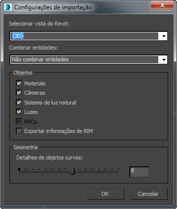 - Não combinar(o padrão). Importa cada entidade do Revit como um único objeto do 3ds Max.