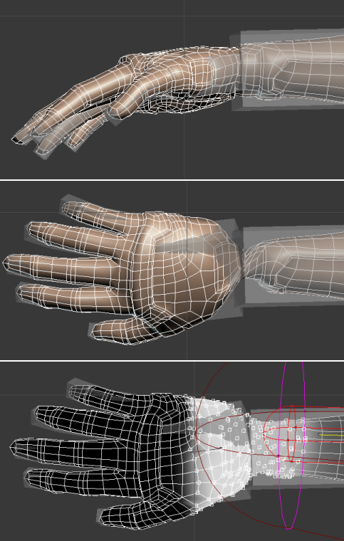 Parte superior: posição original; Centro: pulso girado usando o peso linear padrão; Parte inferior: usando quatérnions duplos, resolve o recolhimento da malha