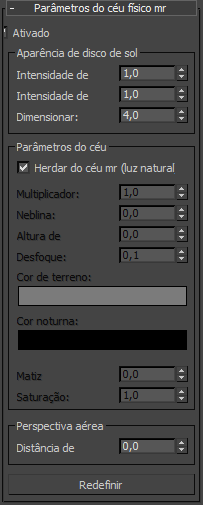 - Quando ativado, utiliza as configurações equivalentes do componente mr Céu do sistema Luz do dia atual para substituir os parâmetros restantes de mr Céu físico, exceto Perspectiva aérea. Padrão = ativado, que é recomendado.