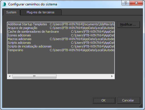 O 3ds Max usa caminhos para localizar diferentes tipos de arquivos, incluindo padrões, fontes e arquivos de inicialização do MAXScript. Você usa o comando Configurar caminhos do sistema para abrir a caixa de diálogo Configurar caminhos do sistema e personalizar estes caminhos.