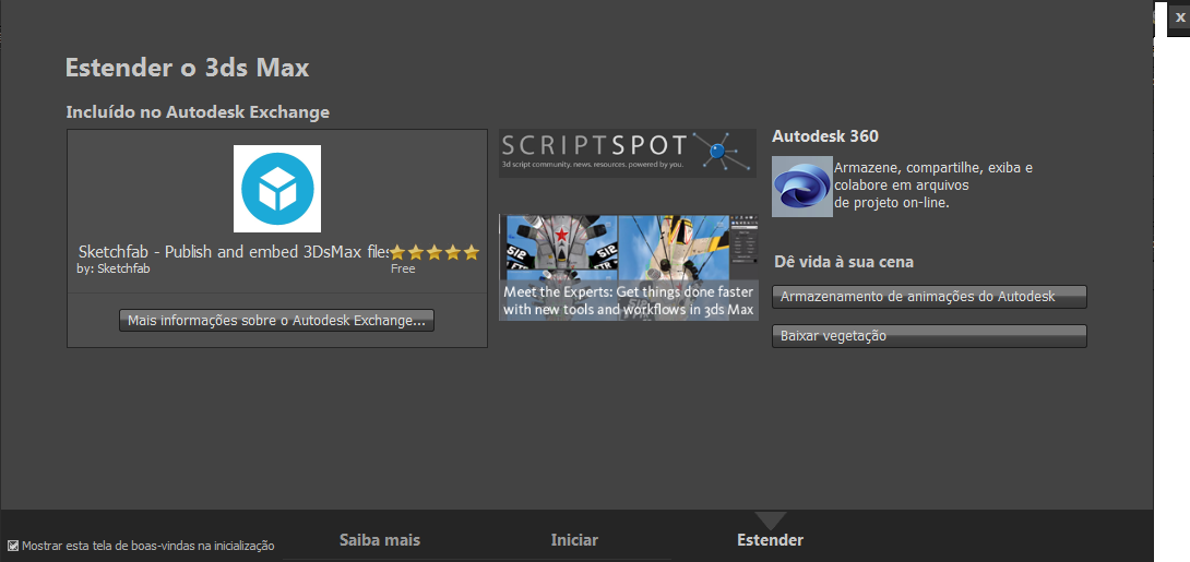Fornece informações de aprendizagem, métodos para criar uma nova cena ou para abrir arquivos recentes e acesso a diversos recursos da Autodesk para o 3ds Max.