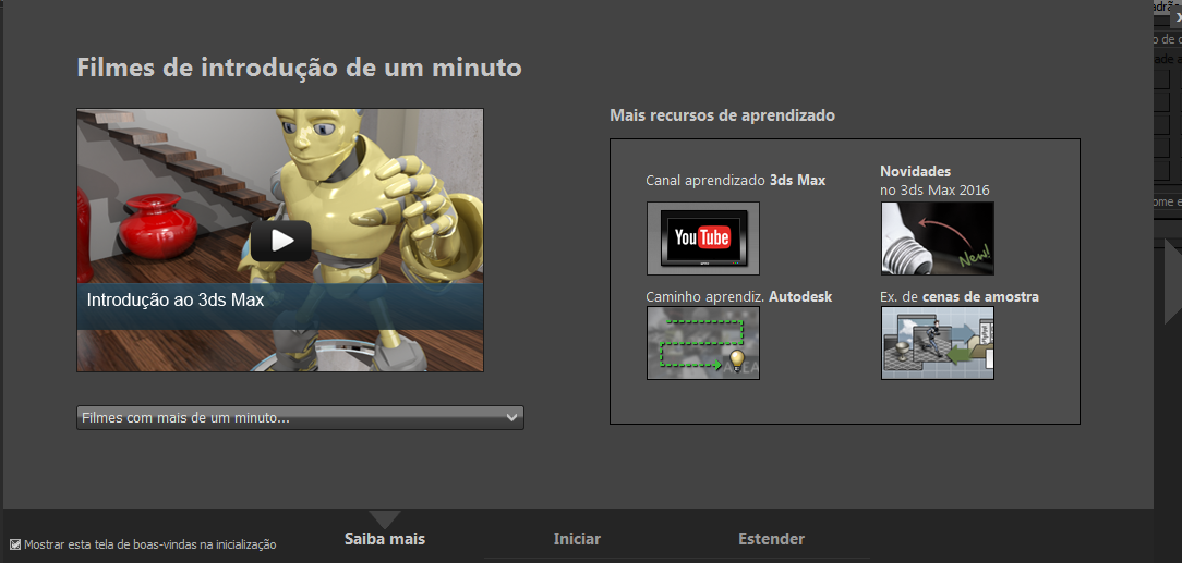 - Apresenta uma lista de filmes de introdução de um minuto, bem como outros recursos de aprendizagem, incluindo os links para o canal de aprendizagem do 3ds Max, o caminho de aprendizagem do 3ds Max e arquivos de amostra que podem ser obtidos por download.