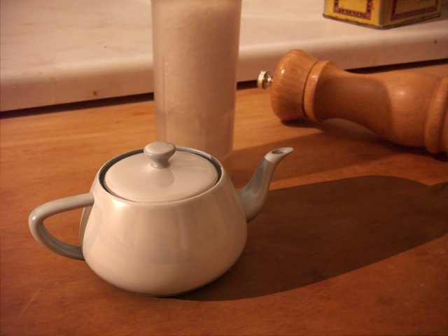 Concluímos, assim, a configuração básica. Se você renderizar agora, você deveria ver a chaleira sobreposta sobre a imagem do plano de fundo. A chaleira deve ter uma sombra suave abaixo, que vem da oclusão de ambiente.