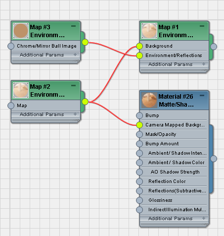 A cena agora contém dois nós de Comutador: um utilizado no ambiente (alterna entre preto transparente e a bola de cromo) e um no material (alterna entre preto transparente e o mapa da câmera).