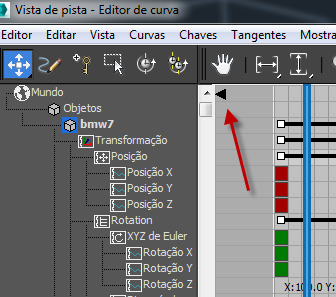 Disponível na janela Key do Track View (nos modos de diálogo Curve Editor e Dope Sheet) é um controle para alternar a janela Controller. O controle adota a forma de um triângulo preto que aponta para a esquerda quando a janela Controller está visível e à direita quando ela está oculta, como mostrado na ilustração anterior. Para alternar a janela Controller, clique no triângulo. Ao utilizar este recurso para ocultar a janela Controller, você pode maximizar o espaço disponível para a edição de chaves.
