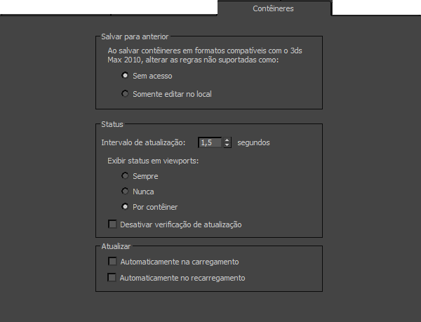 Essas configurações determinam se o 3ds Max executa uma atualização automaticamente quando você carrega ou recarrega um container.