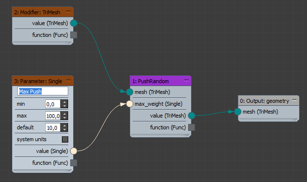 Dar uma olhada na entrada conectores do PushRandom nó. Ele precisa de duas entradas: um objeto para modificar (a malha (TriMesh entrada) e um valor numérico denominado "max_weight." Isto é, como você pode adivinhar, a quantidade para salvar.