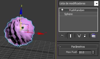A esfera de superfície se torna spiky, porque o modificador empurra seus vértices para fora por aleatório distâncias entre 0 e 10 unidades.