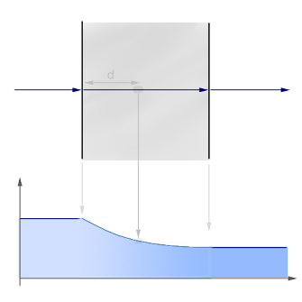 Na ilustração acima, o raio entra a partir da esquerda e na superfície de entrada, diminui o nível e fica um pouco mais escuro (o gráfico ilustra o nível esquematicamente). Ele conserva essa cor ao longo do seu percurso através do meio e, em seguida, diminui o nível novamente ao sair da superfície.
