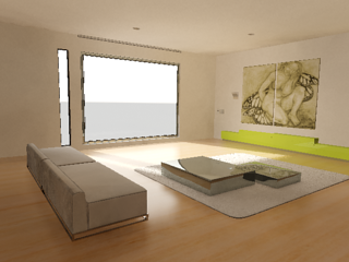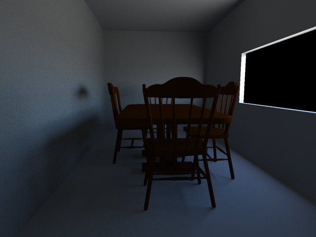 Como resultado, em situações de baixa luminosidade, a configuração Filtro de ruídos=Nenhum pode aumentar de forma significativa a iluminação geral. Na seguinte imagem renderizada, uma cena interna, iluminada somente pela luz celeste que entra através da janela, está muito escura com o Filtro de ruídos definido como Padrão (Reflexos difusos=1).