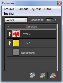 Lista as camadas na textura atual, incluindo cada nome de camada e imagem em miniatura. O conteúdo da camada aparece na imagem na ordem listada, começando com a camada na parte inferior da lista (a camada de plano de fundo) e vai para cima. Em outras palavras, cada camada é sobreposta sobre as camadas abaixo dela na lista.