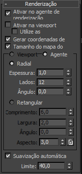 - Escolha esta opção para especificar os parâmetros Radial ou Retangular para a forma como será exibido, quando for renderizado ou quando visualizado na viewport, quando Habilitar na viewport estiver ativado.