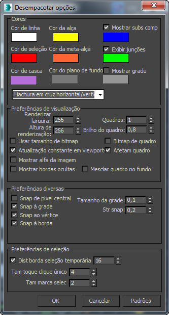 Define as preferências para o editor do modificador de Desembalamento UVW usando os controles na caixa de diálogo em opções para desembalar.