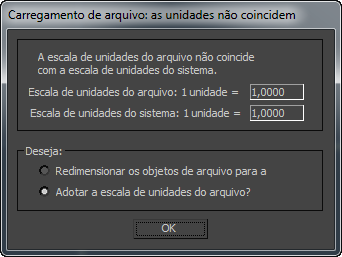 Esta caixa de diálogo aparece quando você abre ou mesclar um arquivo que tenha sido salvo com configurações de unidade do sistema que são diferentes daqueles de sua sessão atual do 3ds Max. A configuração de unidade padrão do sistema é polegadas.