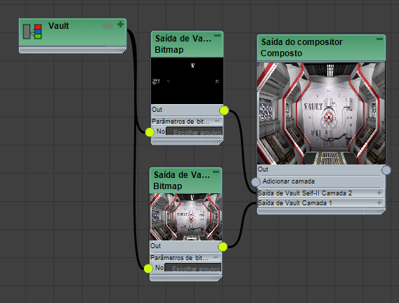 Cada estado é representado na Vista do compositor com pelo menos dois nós: o próprio estado do nó, mostrando todas as propriedades registradas, e o nó de bitmap de saída, com uma miniatura. Além disso, com o comando Vista do compositor (RE), quaisquer elementos de renderização ativados também são representados como nós de bitmap com miniaturas. Todos os nós de bitmap são conectados a um nó de Saída do compositor que mostra todas as saídas de bitmap sobrepostas em uma única imagem e contém controles de composição. Isso representa os dados que os Conjuntos de estados enviarão para o Photoshop ou After Effects, diretamente usando a função Link do compositor, ou indiretamente gerando um arquivo PSD.