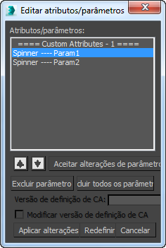 Essa caixa de diálogo exibe uma lista de todos os parâmetros de atributo personalizados atribuídos ao objeto atual no nível atual. O comportamento da caixa de diálogo é descrito nestes dois procedimentos: Para editar um parâmetro ou um atributo personalizado e Para excluir um atributo ou um parâmetro personalizado.
