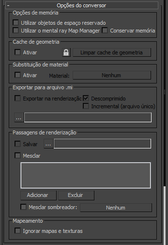 - Diz para o conversor usar a memória da forma mais eficiente possível. Isso pode tornar o processo de conversão mais lento, mas reduz a quantidade de dados enviados para o agente de renderização mental ray. Padrão=desativado.