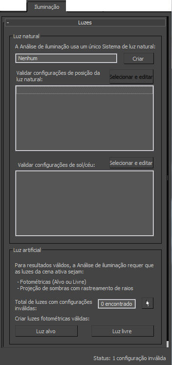 - Exibe as configurações atuais de luz solar e luz do dia. Se uma configuração for inválida, ela aparecerá em negrito: é preciso corrigir a configuração e clicar em Atualizar status para confirmar sua correção.