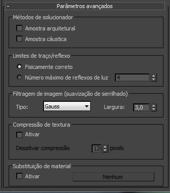 A implementação de Parâmetros avançados contém mais controles de uso específico para o agente de renderização iray.