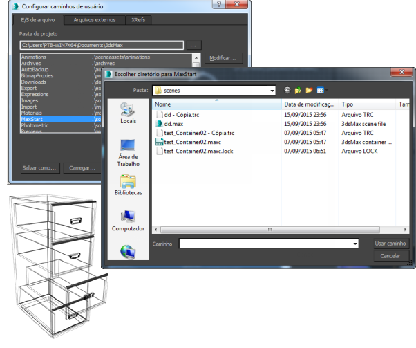 O painel XRefs contém várias entradas de caminho que o 3ds Max utiliza para pesquisar por arquivos referenciados externamente. Elas são utilizadas para compartilhar arquivos em um grupo de trabalho.